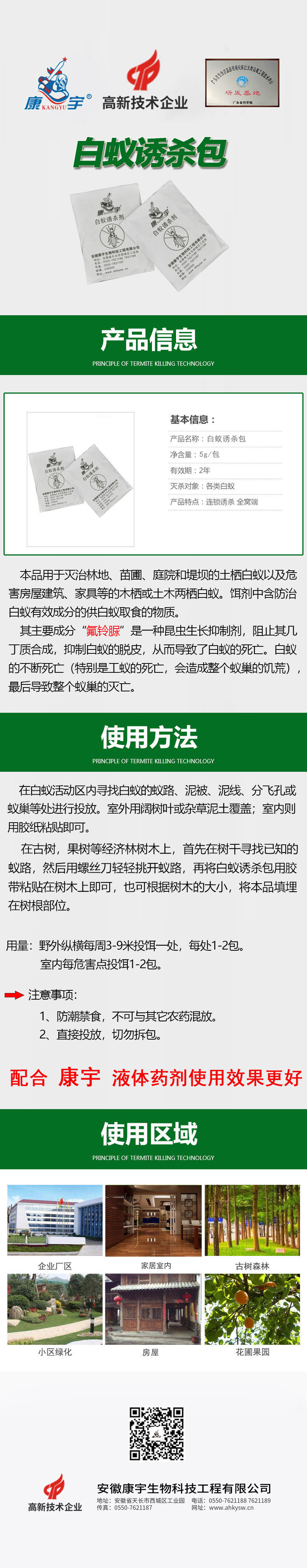 用于滅治林地、苗圃、庭院和水庫、堤壩的土棲白蟻以及危害房屋建筑、家具等的木棲或土木兩棲白蟻。