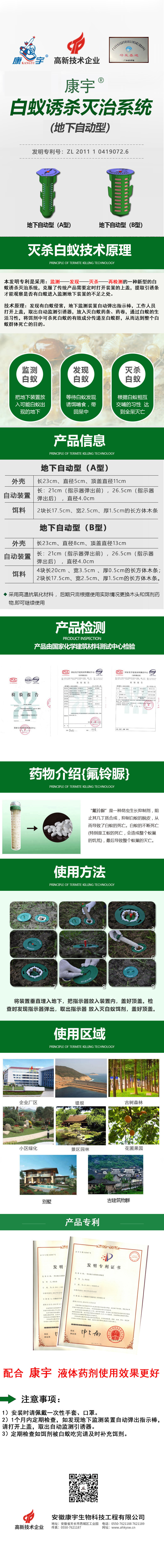 發現有白蟻侵害,地下監測裝置自動彈出指示棒,工作人員打開上蓋,取出自動監測引誘器,放入滅白蟻藥條、藥卷,通過白蟻的生活習性,將餌劑中可殺死白蟻的有效成分傳遞至白蟻群,從而達到整個白蟻群體死亡的目的。
