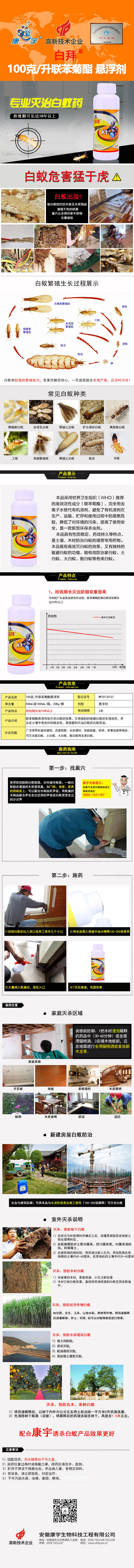 滅治、預防雙重效果,持效期長,安全環保,完全用水替代有機溶劑加工成水懸浮狀態的新型環保殺白蟻藥劑